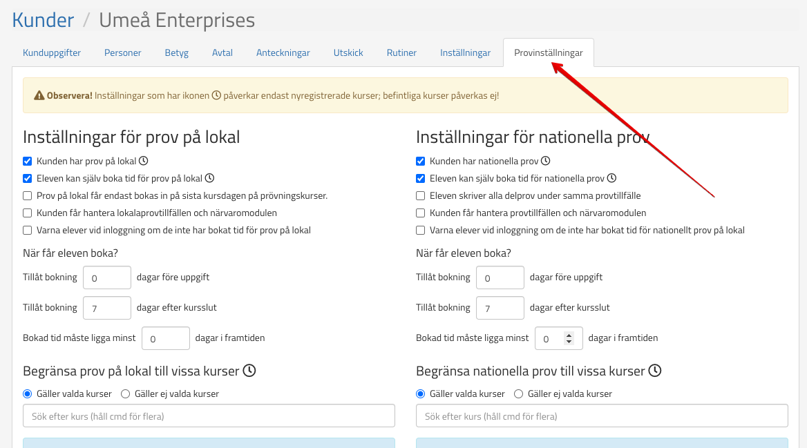 - Kunden har nationella prov. - Bocka i här om kunden vill ha nationella prov på lokal.