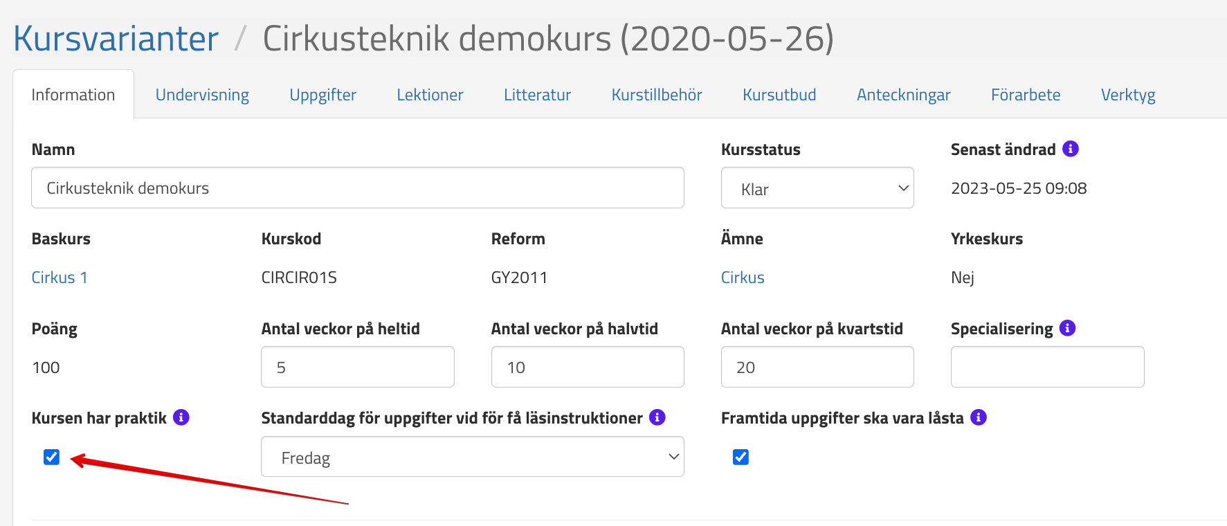 Man ställer in vilka kurser som har praktik genom att gå in på dessa kurser och bockar i den rutan. Så här ser det ut när man går in på en kurs som ska ha praktik: