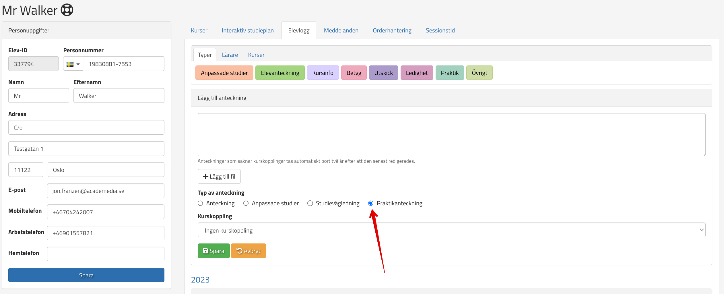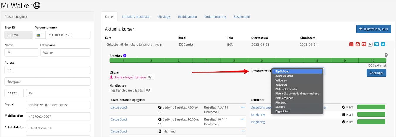 När det är gjort kan man ändra praktikstatus i elevkortet: