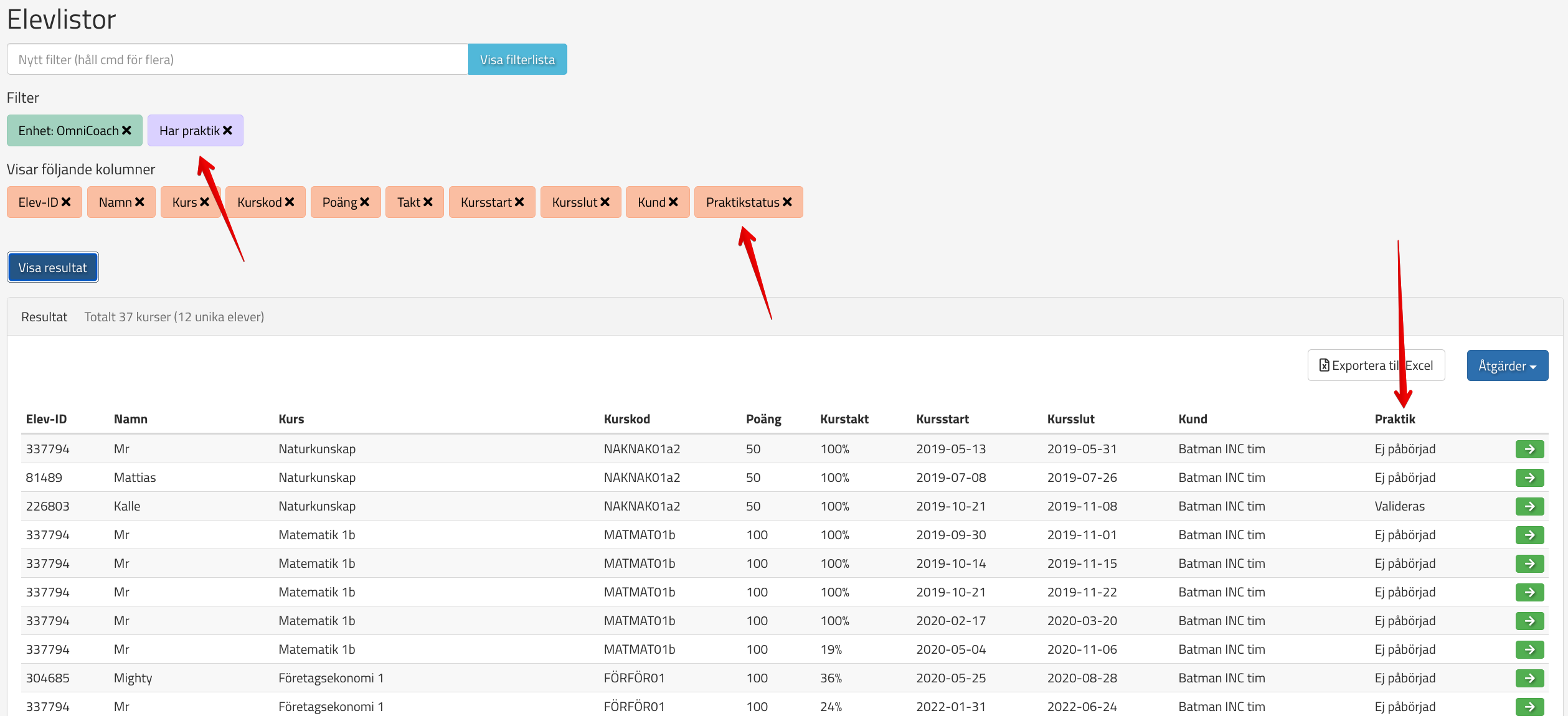 För att få en bra överskådlighet för praktiksamordnaren över eleverna lägger man med fördel in sig som handledare på elevernas praktikkurser, då får man eleverna under "Mina elever". Att lägga in sig som handledare gör man smidigast via elevlistor och använder önskade filter, varav ett bör vara "Har Praktik" och "Visa praktikstatus":