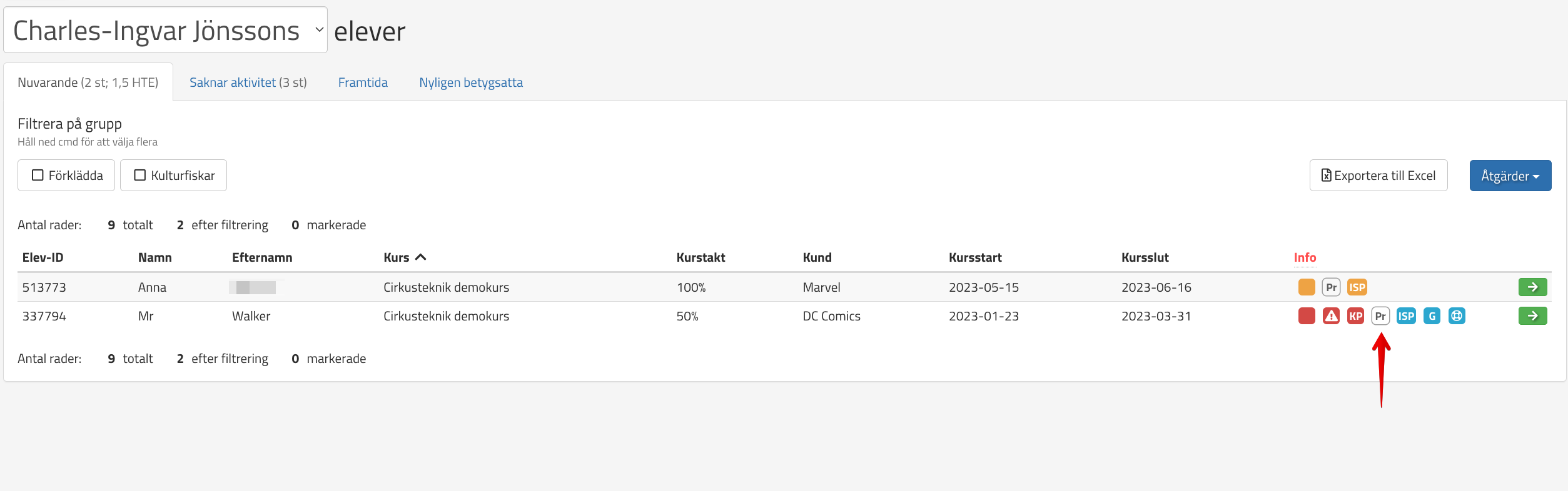 I mina elever under Info kan man se elevens praktikstatus som är färgkodad. Drar man musen över statusen ser man vad den innebär.