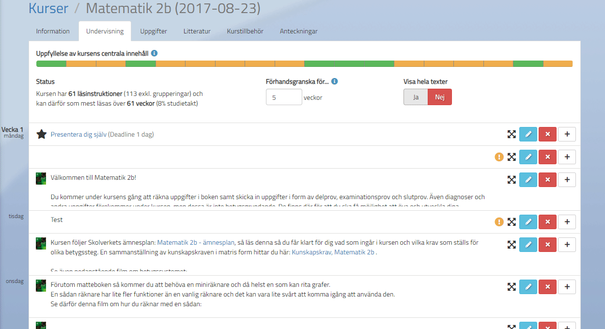 Det går att ändra antalet veckor i förhandsgranskningen, då kan man se vilken läsinstruktion som kommer på vilken veckodag. Om kursen inte innehåller tillräckligt med läsinstruktioner för att kunna visa dem dagsvis så kommer de att visas veckovis för eleven istället. D.v.s. eleven får hela veckans läsinstruktioner på måndagen och de kommer i den ordningen som du har valt (uppifrån och ner). Om kursen får läsanvisningar på veckonivå istället för dagsnivå så ställer man under fliken Information vilken dag man vill att uppgifterna ska bli tillgängliga på.
