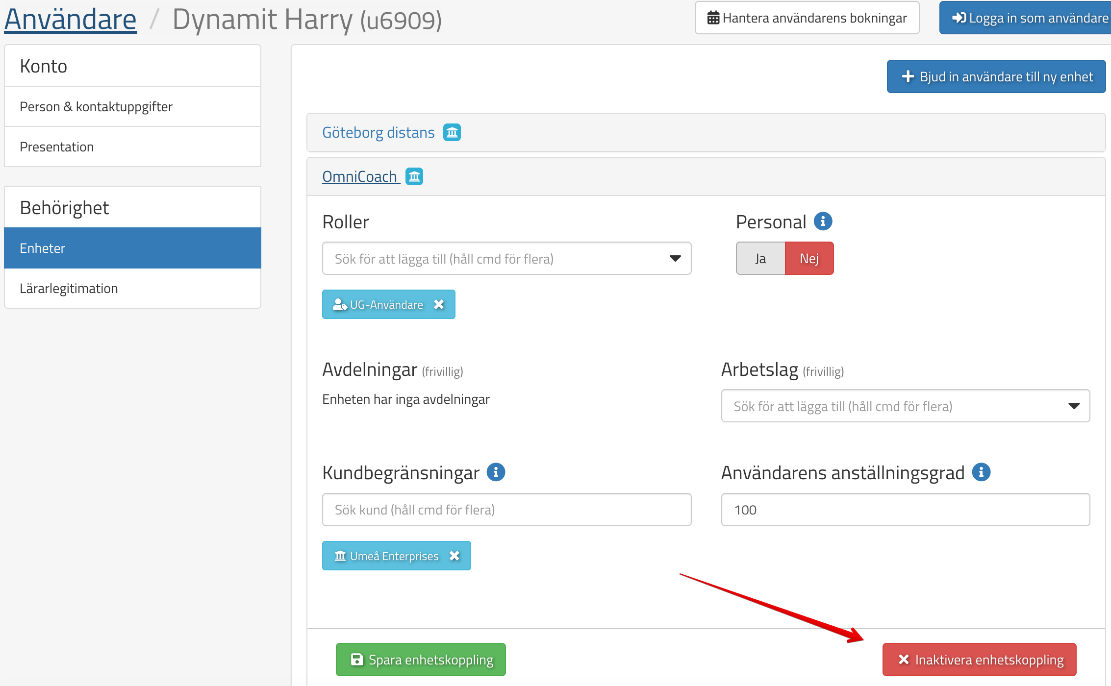 För att inaktivera en användare söker ni upp den, väljer enhet och trycker sedan på Inaktivera enhetskoppling: