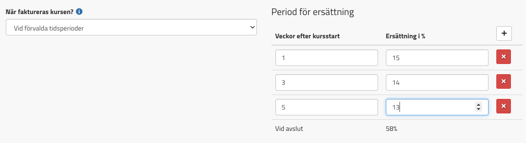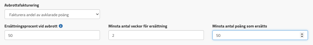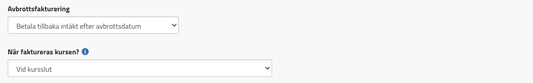 Vid avbrott kommer systemet att behålla den "andel av kursen som eleven läst" till "godkänd pris * (Hur många % av kursen ska faktureras löpande)