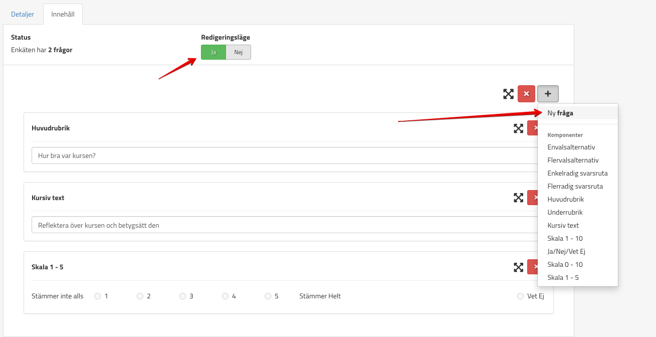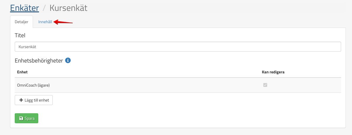 OBS! När ni har skapat en enkät så behöver ni kontakta oss (support@omniwaygroup.freshdesk.com) för att vi ska aktivera den på er enhet samt föra dialog med er när kursenkäten ska tilldelas elever och hur länge den ska vara tillgänglig för dem.