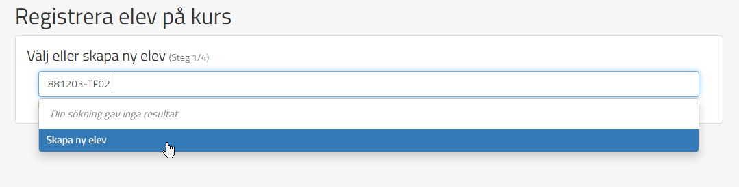 Skriv in den studerandes personnummer. Om systemet inte hittar den studerande välj Skapa ny elev: