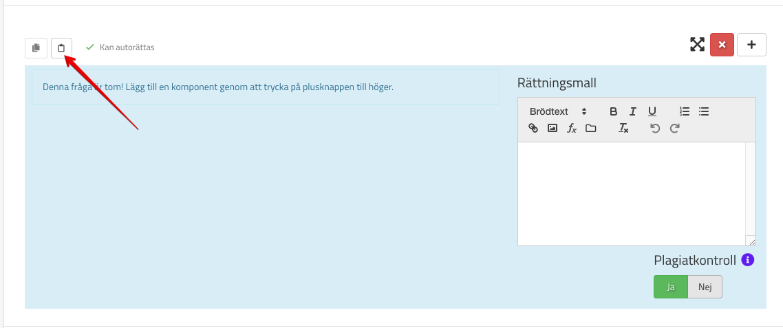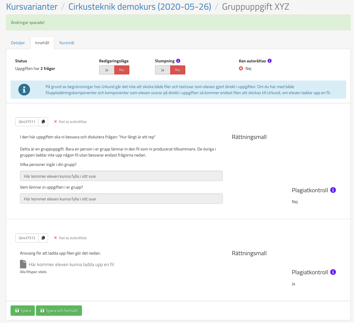Om de studerande ska lämna in något i gruppuppgiften som ska plagiatkontrolleras bör inte alla i gruppen skicka in texten/filen. Annars kan alla lämna texten/filen. Observera att inte alla varumärken/bolag använder sig av plagiatkontroll. I dessa fall saknas alternativet Plagiatkontroll: