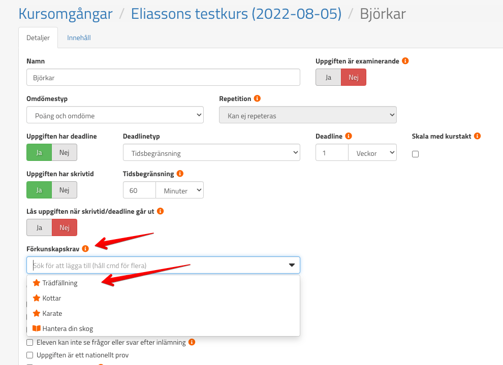 Om du ställer in att uppgiften Björkar har förkunskapskrav: Trädfällning, så kommer de studerande inte kunna öppna Björkar förrän de är godkända på Trädfällning.