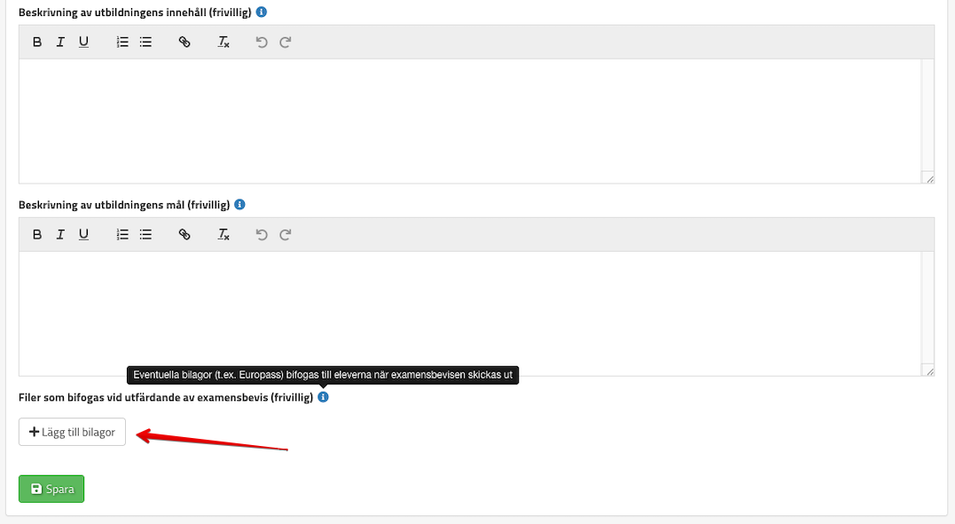 Europass går att lägga till som bilaga, för att göra det trycker ni på Lägg till bilagor i fliken Information på utbildningsomgången: