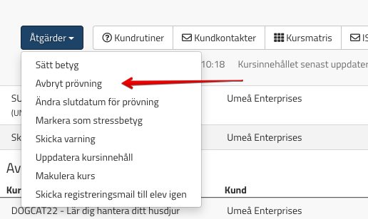 Om den studerande hoppar av den nya kursen: Avbryt den kompletterande prövningen på den gamla kursen som den läste med den ursprungliga utbildningsomgången och sätt Avbrott på den kurs den just genomfört. Se bild nedan för hur du gör för att avbryta prövningen: