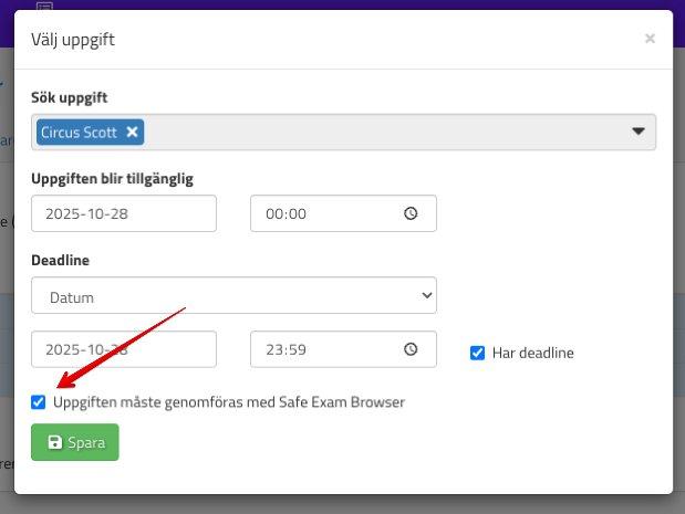 För att aktivera SEB på en uppgift väljs alternativet under Övriga inställningar eller när uppgiften läggs till via kursomgången/tidslinjen. Checka i att Uppgiften måste genomföras med Safe Exam Browser: