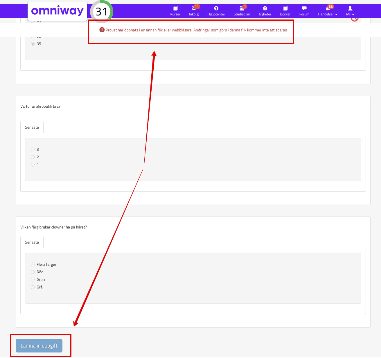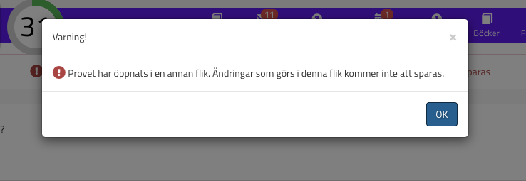 Om uppgiften öppnas i en annan flik eller webbläsare (om t.ex en elev försöker att fuska genom att någon annat startar uppgiften) så dyker detta felmeddelande upp:
